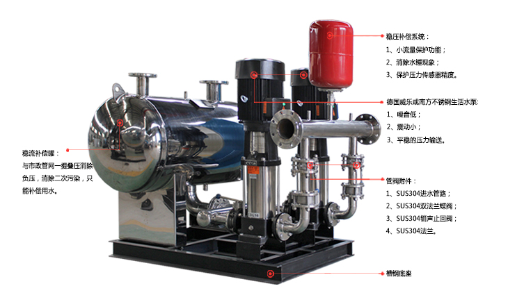 - 設備能夠在市政管網供水量大于用戶用水量時進行變頻恒壓供水。 - 當用戶用水量增加導致市政管網與穩流罐連接處壓力下降時,設備會消除負壓,防止對市政管網產生不良影響。 - 具備停水停機功能,市政管網停水時,加壓機組自動停止運行,供水恢復后自動啟動。 - 小流量休眠功能,用戶不用水或用水量很小時設備自動進入休眠狀態,恢復用水時系統自動喚醒。 - 主要有穩流罐式和調節水箱式兩種。穩流罐式無儲備水量,而調節水箱式具備一定的儲備水量,適用于供水管網不穩定的區域。